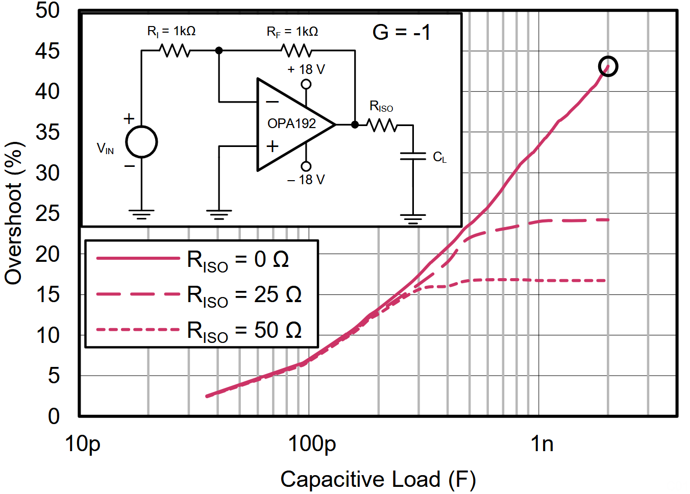 The same graphs suggest that a 25 Ω improves greatly the overshoot, with a maximum value of 25 %, and allows to use an arbitrarily high capacitive load.