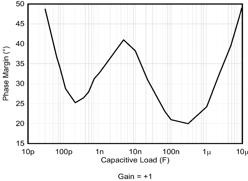 In the discussion, the OPA9942 was suggested. Indeed, it is advertised as having an “unlimited capacitive load drive capability” with a “phase margin of 50° when driving a load of 10 μF and 1 MΩ”. It is indeed the case. However, on some part of the phase margin plots, the phase margin is as low as 20°, and, again, is works much better with an isolation resistor. It should be noted, however, that the OP994 with a 50 Ω isolation resistor has a 45 % worst case overshoot while the OPA192 has only a 20 % overshoot.