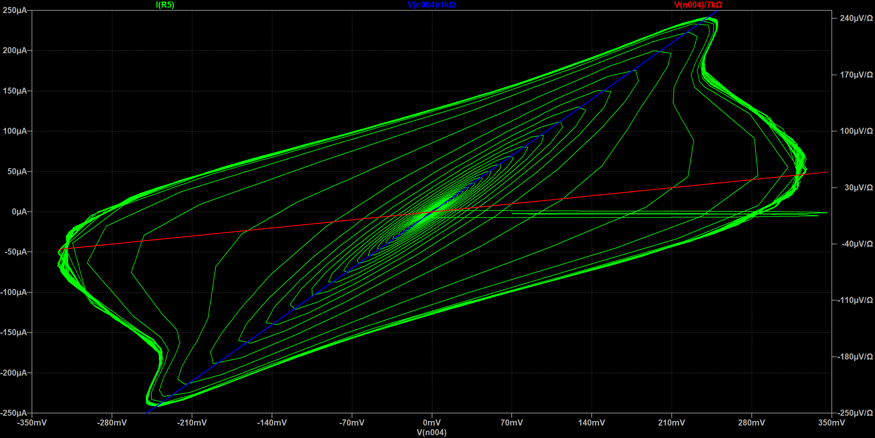 We see that for low amplitudes the trajectory (green) is close to a 1 kΩ resistance (blue) but that for higher amplitudes the trajectory becomes much more complex, with a mixture of reactive behavior and of non-linearities for an equivalent impedance around 7 kΩ, much higher than expected at a first glance.