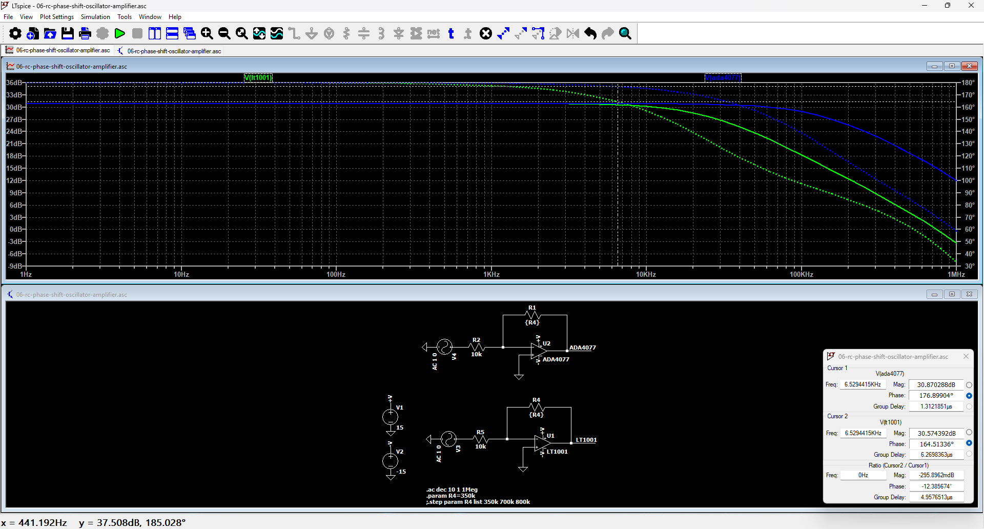 The LT1001 has a low gain-bandwidth product, around 400 kHz in simulation, sufficient to provide the gain requested by the feedback, but with a 15.5° phase delay compared to the ideal value. On the contrary, the ADA4077 had only a 3.1° phase delay. Note the gain with both amplifiers is almost identical.