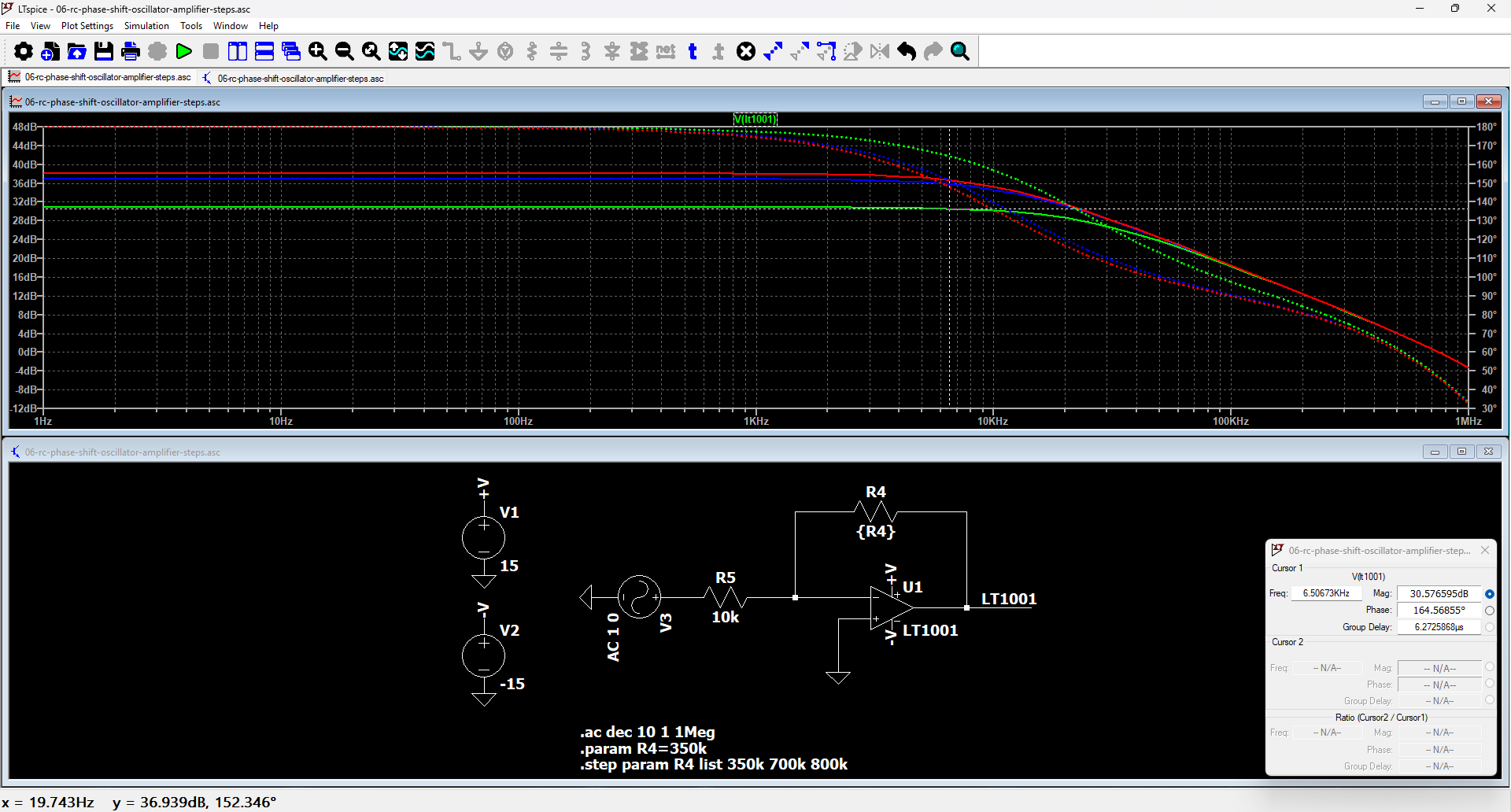 At the frequency shift needed to have a 15.5° phase advance to compensate the amplifier phase delay, a +5.2dB gain increase is needed to compensate the increased losses of the RC network. The value alone is not sufficient to explain the needed resistor values. However, when increasing the gain feedback resistor:
