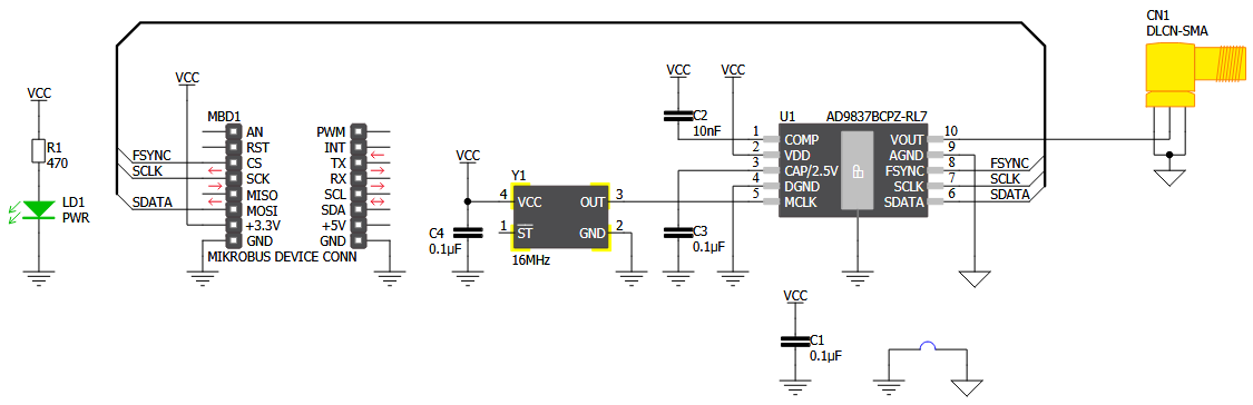 The schematic of the MIKROE waveform 3 click schematic, shown below, is self explanatory, except the dubious layout and grounding: